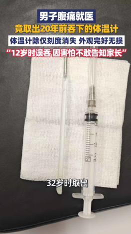 近日,温州。32岁的王先生因腹部消化不适前往医院就诊,检查时竟发现其肠壁附近有一支水银温度计,随时可能引发穿孔大出血等严重危险。经详细询问病史得知,这支温度计是他12岁时不慎误吞的。当时因害怕被责备,没敢告诉家人,而父母忙于工作疏于照看,加之身体一直没有出现异常症状,此事便被渐渐淡忘。医护团队制定了详细的手术方案,利用内镜下异物取出术,仅用20分钟便顺利将温度计取出。这支在体内留存20年的温度计,除刻度磨损消失外,外观依旧完好。